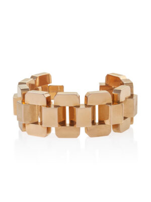 After the outbreak of World War II, gold became scarce, and alternative alloys, including rose gold and lower-karat gold, became more popular. The “tank” bracelet, echoing the appearance of tank tracks, became hugely popular, as did hollow tubogas and snake chains, which also reflected wartime industrial forms. Highly textured metal and pavé-set small stones compensated for the scarcity of large gemstones, while semi-precious stones such as amethyst, topaz, and aquamarine rose to prominence. Patriotic jewellery, including Van Cleef & Arpels’ Hawaii collection and Mauboussin’s Jeep brooch, also became popular and remains highly collectable to this day.