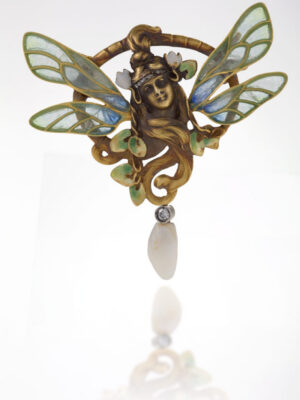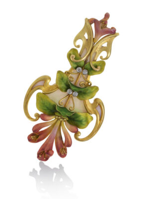 FEATURES: Sinuous lines, ultra-feminine, ultra-floral, funky gemstones, detailed enamel work, vignettes of female figures, natural forms, and a Japanese-inspired linear style that sometimes veered into problematic Orientalism