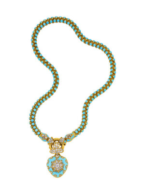 Lockets, pendants, bracelets, and rings meant to contain locks of a beloved’s hair became widely popular. The same can be said of acrostic jewellery—pieces in which the first letter of each centre stone spells out a love message. Although acrostic jewellery was originally made fashionable by Marie Antoinette and the French firm Mellerio, Prince Albert revived the practice by commissioning acrostic jewels for Queen Victoria and their daughters. Early Victorian jewellery is charged with symbolism. Entwined snakes, symbols of eternal devotion, became popular on arm bands and wedding rings. Pieces in blue enamel and turquoise were prized for their association with the colour of the forget-me-not, which, in the Victorian language of flowers, was the ultimate symbol of enduring romantic love.