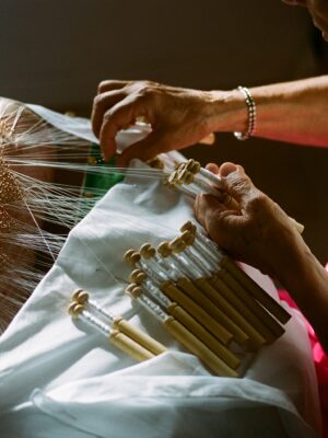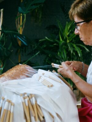 María Luisa Blanco knitted UMT chair’s backrest and seat for more than three years. As an elementary school teacher by profession, she was forced to learn bobbin lace as part of the compulsory training for female teachers she received in one of the schools of the Sección Femenina (Women Section) of the Spanish fascist party, La Falange, in Deba, Guipúzcoa, in 1963. The weaving follows a pattern combining the most characteristic types of bobbin lace stitches including the “half moon,” the “little fish,” the “three-legged spider,” and “Ulrike’s star,” amongst others, with the final design becoming a sort of technical archive. The making process is integrated within the chair, with the weaving cushion, the 24 carat gold-plated needles and the wooden bobbins becoming part of the chair. The cushion takes its shape and proportions from the pillow of the classic LC4 Chaise Longue by Le Corbusier, Pierre Jeanneret and Charlotte Perriand, whose involvement in the making of this classic modern piece of furniture has been historically overlooked. The chair’s structure and legs holding the lace were reduced to the minimum expression in order to single out the lace-made backrest and seat. The chair structure follows a geometry resembling that of an arachnid’s body, an animal with which women who make bobbin lace are often associated.