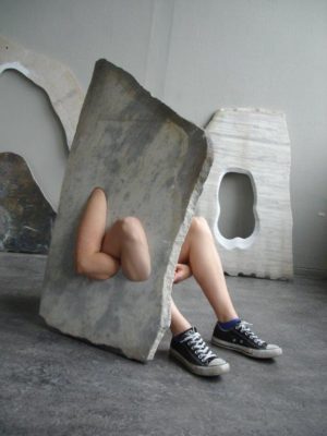 The plates can be seen as objects that captured a moment in time when my body actually merged with them (almost like an archive). Since this moment my body is constantly changing and soon I might not fit them anymore. Therefore I don’t think of the moment of wearing them as a performance but rather an attempt to fit them again. The marble plates will outlive my body and are forced to function as autonomous objects.