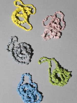 Maybe this is shifting the authorship of the work to a process that defines the outcome. The process is not really about letting go, I think; I always try lots of things of which the result is unknown. With this particular work though it just started as simple as that: I made these shapes using my fingers in a methodical way. Perhaps it sounds a bit silly, but at the same time they immediately made a lot of sense to me as beads, and it took me a long time to get them right in terms of size, proportions, making a series of colours that worked with the different shapes, without them looking like cheap stone necklaces, etc. I realise they look extremely “obvious” in one sense, but it wasn’t easy to get them to look like that! Haha! That sounds really quite ridiculous, spending a lot of time and energy on making something look obvious, that’s good. I do like the idea of working with limited means as well; I’m not someone who uses a lot of tools and equipment. The restrictions and rules, I think, are also ways of working out what to make and if to make anything at all; defining the working space. (As in what can I add to everything that’s already been done). Moving in a limited space means you have to be inventive, consequently everything is possible, that can make it hard to do anything at all. Martin Creed talks about this as well:
