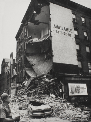Gordon located the violence in modern architecture not in its fallout, not in the ruins it leaves in its wake, but in its ravaging drive toward ever-greater functionalism. Here are two sides of the same coin – order and disorder – but the direction in which one sees an imbalance determines how one responds to a decrepit building, or city, for that matter. Ruin, for Gordon, was not the absence of a solution; it was the origin and fate of architecture – a place from which to propagate the ethos of anarchitecture by way of assisted, aestheticised decreation. A building whose outer wall was turned to rubble by a gas-leak explosion – its interior rooms exposed to passersby on the street below – was for him a poetic device; he photographed it not to highlight the obviously tragic consequences but to give possibility to its new-born dysfunction. The image is a reframing, at once bleak and optimistic. As one critic has noted, the ‘available’ sign still affixed to what remains of the wall is, for obvious reasons, ‘grimly humorous’ but escapes its own irony in that it really does make available to the onlooker a new perspective ‘untroubled by exterior boundaries.’6