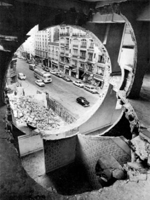 It is one thing to find your way to this city of Thomassons, to admire its dissonance, perhaps photograph or write about it, but to inhabit it, intervene in it, to serve its entropy is quite another. Gordon Matta-Clark, who coined the term ‘anarchitecture’ in the mid 70s, was certainly one such person. The term is fittingly unmoored, referenced at different times as a method, an exhibition which took place in New York in the 70s, a series of meetings which preceded the exhibition, or more generally, a set of ideas about art and architecture. In a time where the development of American cities, especially New York, was being aggressively streamlined by Corbusierian modernism – standardised housing, free-flowing expressways and towering office blocks – Gordon and his friends carved out their own spaces in the ruins of a city being torn down and built anew with little regard for its working-class inhabitants. He entered derelict buildings set to be demolished in order to make in them his extraordinary ‘cuts’. The widening boreholes he cut out of various floors of an apartment block in Paris, for instance, serve to intensify, not solve, the ambivalences of a structure falling to pieces; a house in ruins, marked by destitution, poverty and structural violence (both physical and political), bears an inadvertent beauty, that of an object being slowly drained of its function by the passing of unseized time. On display is not only the decomposition of material but of enclosure, border, definition, privacy. His ‘cuts’ were therefore a kind of collaboration with, or extension of, the recalcitrant force of decay in which he saw the founding properties of an architecture opposed to the harmonious structuring of society.