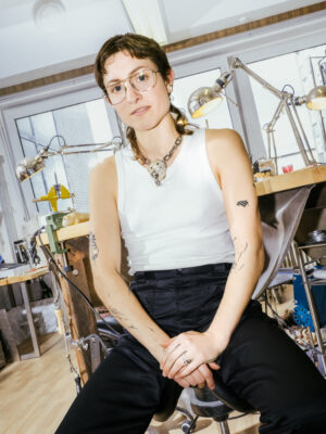 Corrina Goutos (1991 New York State) is an artist working in jewellery, objects, and installations currently based in Hamburg, Germany. Having coined the term “Anthrosmithing” to describe her interdisciplinary practice- Corrina renounces the concept of a “raw material”, instead considering that when a craftsperson imprints themselves on a material, they are but one of many agents constantly reshaping it. Corrina’s future artifacts tell a story of mankind, from achievements to decadence. Precise pre-industrial handicraft is applied to post-consumer detritus, with the same intention a smith would give a rare resource of Earth. With radical consideration of the political ecology of non-human and human agents, Corrina’s eerily harmonious conglomerates dismantle hierarchical narratives of the master craftsman with nature at his disposal.