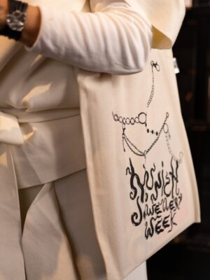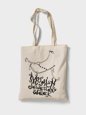 Get your hands on this small-edition tote featuring this year’s MJW 2026 identity – a playful tangle of chains, earring hooks, charm locks and closures. Jewellery components unfastened from the body and set loose across fabric. Practical, collectible, and just the right amount of extra for Munich.