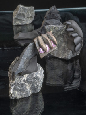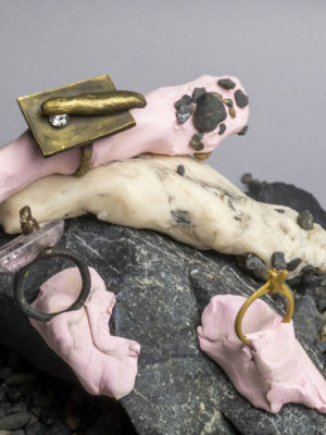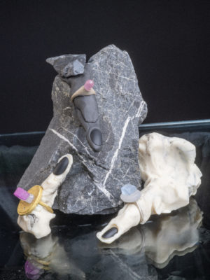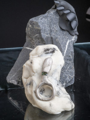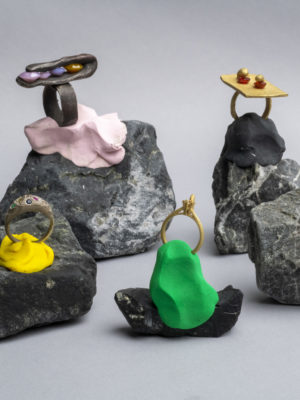 Fritsch is a rebellious jeweler, constantly remixing jewelry tropes into delightful, one-liners. Take the artist’s most recent flirtation with the solitaire. It’s a classic jewelry staple reimagined with the darndest of intentions: fake diamonds have been set with swollen prongs, stuck under big lumps of metal lumps, or set in place by the most minimal of passes, appearing to be on the verge of escape. Other stones to be found Fritsch has carved some of the other stones himself, allowing for an entirely new elaboration of his inventive, jewelry vocabulary. “I love coming back to this dinosaur of rings; everybody has an idea of it when they hear the word solitaire, but giving it a new shape, a mood, and attitude of today is something I don’t ever get tired of.”