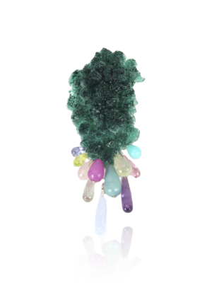 The latter’s claim to fame is their role in the contemporary renaissance of the use gemstones in jewellery after the 1970’s, ‘due to its rediscovery as a material that can be creatively shaped by artists.’ This was said by Wilhelm Lindemann in the nsaio6 – New Jewellery from Idar-Obserstein catalog, the original exhibition from which Idar’s presentation at SIERAAD is an excerpt. ROCK STARS. Jewellery from Idar-Oberstein focuses specifically on the application of gemstones in contemporary jewellery by its bachelor and master students, made over the last fifteen years. In this show you’ll find many marvels: a knuckle-duster carved out of solid agate (Lina Goltsius); mushroom shaped pendants hand-cut from real pearls (Sabine Wehr); industrially elegant compositions of emeralds or lapis with plastic and steel (Matthias Dyer); and dazzling experimental faceted smoky quarts and rock crystal (Azhar Ali Malik), just to name a few.