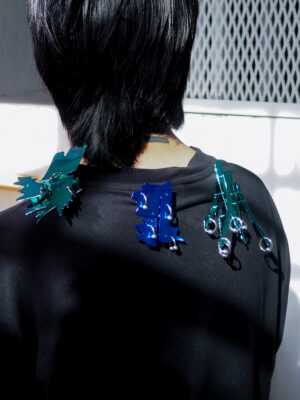 The original piece was 3D modeled and 3D printed in stainless steel. I cleaned and chromed the piece, so it ended up having this thick diamond blue chrome layer on top. But the original piece was too big for daily wearing, of course, and I wanted to do something much more wearable for the CO Store, but still quite dramatic, so I still kept the size as big as possible. They will be available in two colours: silver with rhodium plating and another version in a black diamond glossy colour.