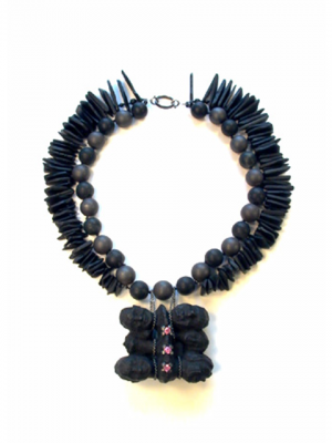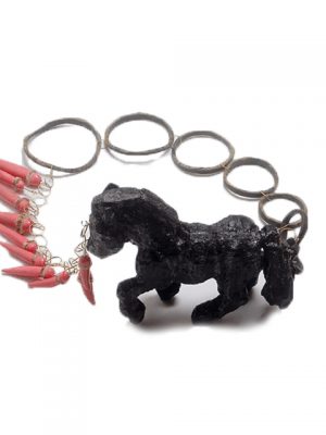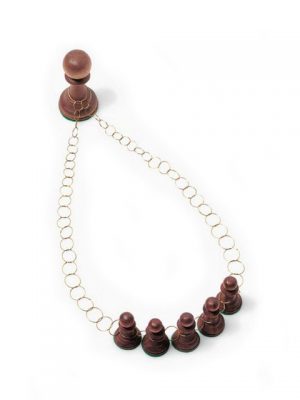 Its interesting that you chose these three, because they all mark a period of time: one was the first after Idar-Oberstein, second one was my first after Sandberg, and the third is my first solo show. It shows what I’m looking for in the collier: its a closed circle, like a movie or a symphony: you starting somewhere, you give the introduction, then you develop the theme, you come to the main part and then you let it clean out – that’s a collier. And of course in each work I make, I try to emphasize one story. Sometimes I mess up and tell three. But if I manage, I tell one story. In ‘Hope’ its about two families, mama, papa and a daughter. You are raised by parents and now its time you are pushed out, suddenly you start waking on your own. That is how I felt at the time. I started to study at Idar-oberstein because I wanted to work with stone, but after two years the amount of stone work decreased and the amount of wood carving and sculptural elements increased. So here I have a big sculptural part that is wood and around it there are these stones, with hope that one day I’ll come back to the stone. Also, the concept of hope is always identified with the color green, but I’m not sure its correct, so I made a black collier with pink stones.