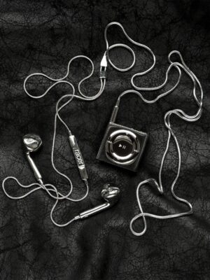 Estonian brand Racer Worldwide, known for its aughts youth culture-inspired design, recently came out with the RacerPod Pendant, a metallic jewellery piece crafted in the exact form of a real-size MP3 player, which can be styled as a clip on the clothes or in combination with their RacerPods Necklace, a necklace shaped like the original Apple wired earphones. On the brand’s website, the copy states that the RacerPods ‘are deliberately, gloriously useless’. In stripping away the original’s functionality, they reimagine electronics as pure adornment, nodding to digital culture while refusing its extractive logic. This is jewellery that doesn’t want anything from you.