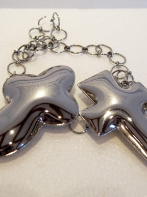 SC: For me, everything was more about concept in the beginning. Of course it’s always interesting to find a new technology or material, to be innovative. But on the other hand it’s even harder to do something new and be surprising WITH the traditional techniques. Basically everything has been done. So this is exactly the point that is more interesting to me – how you can be innovative within tradition. I’m doing this press forming with stainless steel, which is much easier than non-ferrous metals because you don’t have to make the material soft before. It’s quicker that way. And then the welding of course is “relatively new” in jewellery, but not new at all. I chose welding to construct the pieces because it would be a nightmare to solder the steel. So it’s all practical. In the conception of my work it’s more about the form. The form is what takes me time, to find the right from in 2D and then to translate that into 3D.